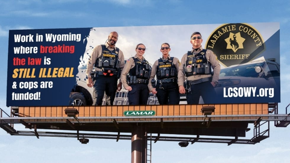 Denver is cutting $8.4 million from its police budget and the Laramie County SO’s ad reads: “Work in Wyoming, where breaking the law is still illegal & cops are funded!"