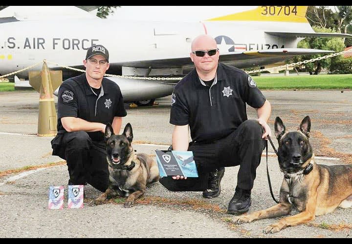 The Yuba City (CA) Police Department K-9 unit's I² night vision device allows Officer Kenny Sowles (right) to track his K-9 via the infrared collar he wears. (Photo: Yuba City PD)