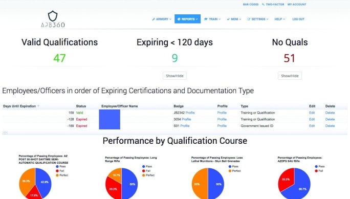 APB360 can even track the agency's ammo supply. "When somebody takes a course of fire and uses 50 rounds, there is a checkbox in the software that will automatically reduce the agency's ammo stores by that amount," Lyons says.