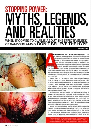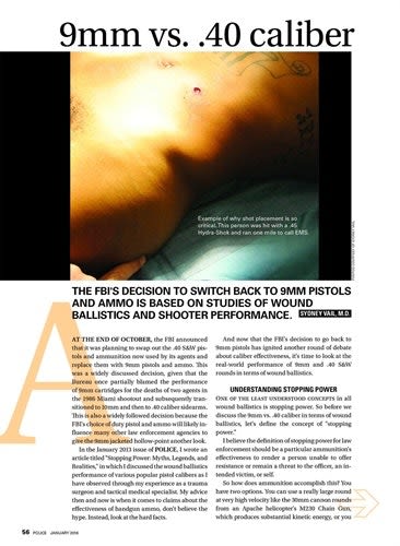 In October 2015 the FBI announced that it was switching from .40 S&W handguns to 9mm handguns. Dr. Sydney Vail—trauma surgeon, SWAT medic, and wound ballistics expert—wrote this discussion of why the FBI made this decision and why he believes it is the right one. The article includes a look at the FBI's recent history with handgun ammo, the performance of various sizes of pistol rounds, and Dr. Vail's experiences treating gunshot wounds. His conclusions can be summed up in this statement: "From a trauma surgeon's perspective, both the 9mm and the .40 caliber can wound, injure, incapacitate, or kill. However, shot placement is the best predictor of accomplishing the intended goals." No article published in POLICE before or after has garnered as much attention and debate.—January 2016
