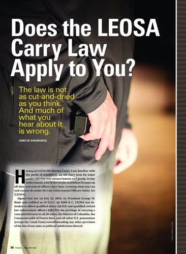 NRA Associate Litigation Council James M. Baranowski explains the Law Enforcement Officers Safety Act of 2004 (LEOSA). This article discusses who qualifies for LEOSA rights and the steps qualified officers, former officers with 10 years of service, and sworn retirees have to take in order to exercise their LEOSA rights. In addition, Baranowski looks at the arguments some agencies use to deny LEOSA rights to officers who are qualified and explains the pertinent case law. The article also explains how LEOSA rights do not supercede all federal, state, and local statutes that ban carry into certain areas. LEOSA-qualified person must also adhere to the wishes of private individuals and companies who prohibit weapons on their properties.—January 2014