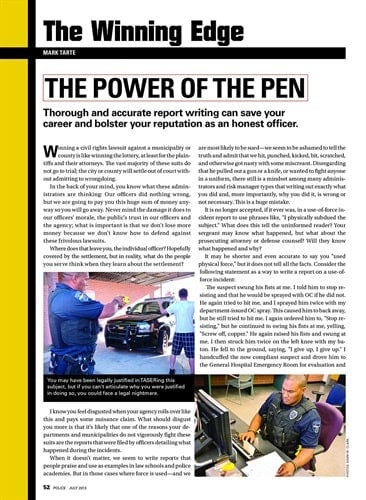 This "Winning Edge" article by Mark Tarte discusses how to write more effective and comprehensive reports. We included it in our "Winning Edge" department, which generally involves tactics because quality reports can be critical in an officer's legal defense. "It is incumbent upon you to paint a word picture for the jury and others that will read your reports. You can be the best shot, the fastest runner, an expert at interviewing, and look like a Marine recruiting poster in uniform, but without the ability to write a proper and factual report, it will all be for naught," Tarte wrote. The article also addresses the need to preserve physical evidence of attacks on officers such as torn uniforms and damaged or broken equipment. And of course, it discusses the role of video in evidence capture both for and against the officer.—July 2013