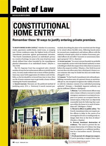 This extremely educational "Point of Law" article from Devallis Rutledge focuses on when law enforcement officers can legally enter someone's home. He wrote: "Private residences enjoy the highest levels of Fourth Amendment protection against governmental intrusion. 'The Fourth Amendment protects an individual's privacy in a variety of settings. In none is the zone of privacy more clearly defined than when bounded by the unambiguous physical dimensions of an individual's home.' (Payton v. New York)" The article details 10 reasons that officers can enter private homes: search warrant, arrest warrant, consent, rescue, threat to officer or public safety, prevent imminent destruction of evidence, fresh pursuit of a dangerous suspect, prevent escape of detainee/arrestee, prevent substantial property damage, and probation or parole search. Rutledge cautions: "When exigencies require immediate action, search warrants are unnecessary; however, if the situation is not immediately threatening, it's best for you, your department, and your local prosecutor that you get a warrant. Warrants increase your protection against civil liability (Messerschmidt v. Millender) and reduce the risks of suppression of evidence. (U.S. v. Ventresca) This is why your rule-of-thumb should be: seek a search warrant whenever practicable."—February 2014