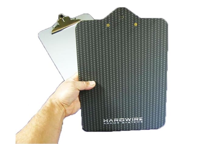 Hardwire's Bulletproof Clipboard is designed for everyday use and is able to become a layer of protection in an emergency situation. The armor technology is derived from solutions developed for the Department of Defense. All Hardwire bulletproof clipboards meet Bulletproof Products NIJ Level 3A protection. The product is lightweight, functional protection available in multiple finishes: carbon, camo, and dry erase/whiteboard.