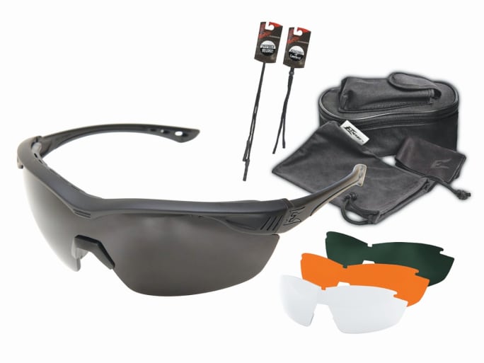 In Edge Tactical Eyewear's Overlord Kit, the flexible and durable rubberized frame is equipped with a soft thermoplastic rubber nosepiece and temple arms to create a comfortable, nonslip fit. The four blade-style lenses can be easily and quickly interchanged with one gloved hand. All non-polarized lenses feature Vapor Shield, a built-in "military grade" anti-fog technology to completely resist fog, no sprays or wipes needed. The Overlord Kit includes the soft-touch matte black frame, four interchangeable lenses (clear vapor shield, tiger’s eye vapor shield, G-15 vapor shield, and polarized gradient smoke), collapsing MOLLE-compatible case, microfiber lens cleaning bag, chamois cleaning cloth, and noose and neoprene strap eyewear-retaining leashes. http://edgeeyewear.com/site_tactical/