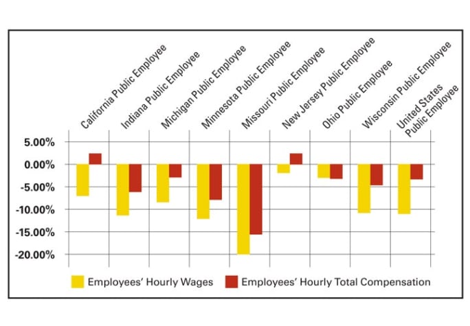 This chart shows public employees' wages and compensation as compared to that of their private sector counterparts. Source: Employment Policy Research Network.