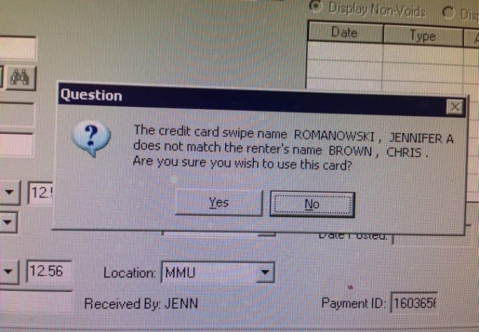 The Bluebird program also has a feature in which after a credit card is swiped, the system prompts the rental agent to key in the last four digits of the card. This ensures that the information from the swipe matches the number embossed on the front. As well, the system displays a warning if the renter's name doesn't match the cardholder's name upon swiping the card.