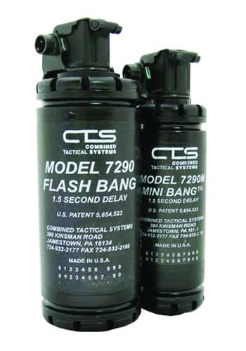 Combined Tactical Systems' Model 7290 Flash-Bang is engineered to provide versatility and functionality while maintaining a high degree of safety. The Model 7290 produces an explosive report and a brilliant flash. Energy is released radially and equally through top and base ports at an angle of 15 degrees off the vertical axis. The balanced output is designed to ensure that the device does not become a dangerous projectile.