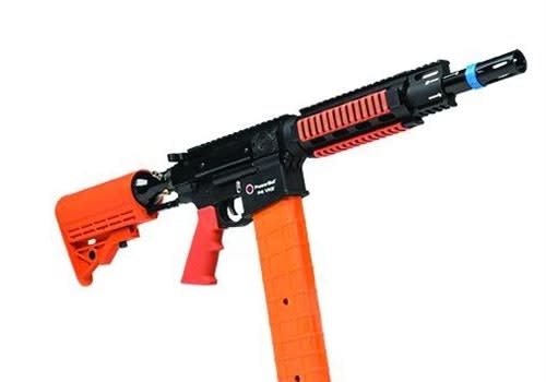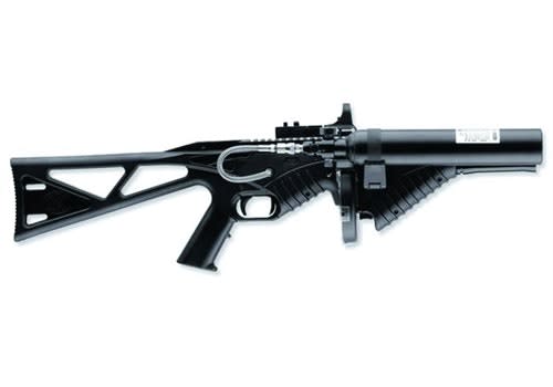 PepperBall's less-lethal system called "VKS," for "Variable Kinetic Speed," provides multi-mission capability and variable payloads in a single M4-styled platform. The company says projectiles deployed with the VKS have a variable kinetic impact of between 13 and 30 Joules. Target accuracy is 120 feet, utilizing PepperBall's patented VXR fin-stabilized projectiles, with area saturation available to over 200 feet. The VKS comes standard with a Picatinny rail mount.