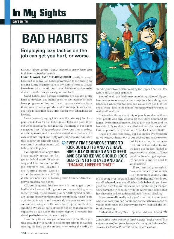 Being lax on duty can cause injury or even death. In this installment of his In My Sights column, Dave Smith reminds readers that it's important to be on the lookout for bad habits in yourself. This includes turning your back on a subject while using your radio or phone and "standing next to a violator reading the implied consent law within easy striking distance."