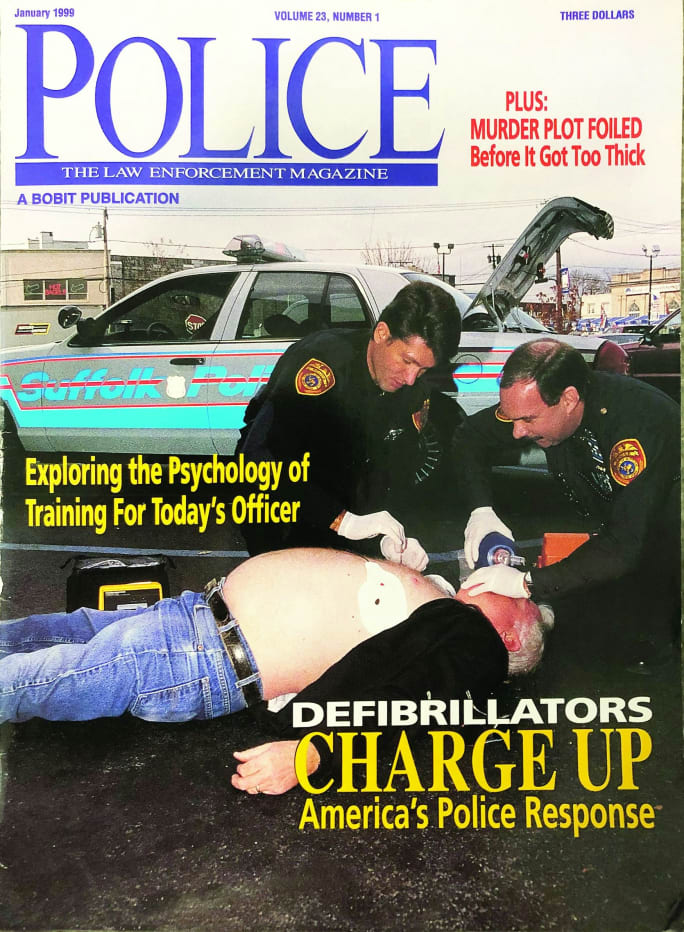 The cover story for January 1999 discussed law enforcement agencies beginning to acquire, and train officers to use, automated external defibrillators (AEDs).