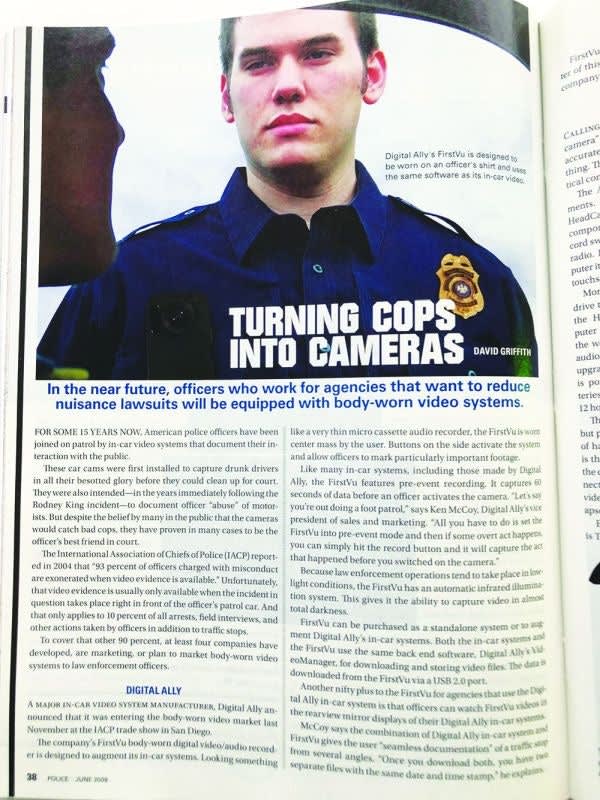 Editor David Griffith opens an article about this technology with the deck, "In the near future, officers who work for agencies that want to reduce nuisance lawsuits will be equipped with body-worn video systems." He explains that dashcam video had helped exonerate officers accused of misconduct, but that such video was only available in about 10% of arrests, field interviews, and other incidents because dash cams only capture what happens directly in front of a law enforcement vehicle. He goes on to say that companies had recently developed body-worn cameras to fill in the gaps.