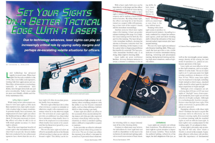 Officers still debate the pros and cons of laser sights for duty weapons, which this article covers. It opens by explaining that since their introduction in the 1970s, laser sights had become easier to use and maintain and more reliable.