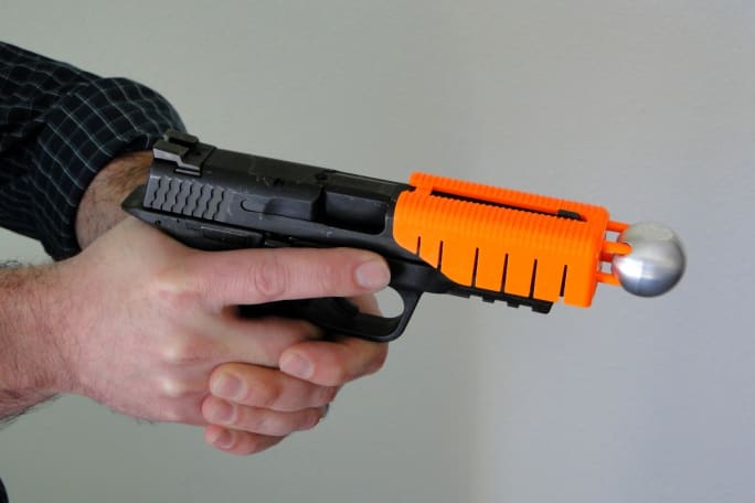 The Alternative from Alternative Ballistics is a blunt force impact device that is fired from an officer's duty pistol. The Alternative projectile fits over part of the slide and the muzzle of the pistol. "Once the sidearm is fired the bullet travels down the barrel and welds itself inside the projectile," the company says. "The bullet and projectile instantly becomes one unit and the kinetic energy is simultaneously transferred, which propels the projectile toward the target." The company says the impact of the Alternative projectile is the equivalent of being hit by a "170-mph fastball." According to Alternative Ballistics, the Alternative is intended to be used in situations where deadly force is legally justified. Once the Alternative has cleared the muzzle, the officer can follow up with deadly force, if necessary.