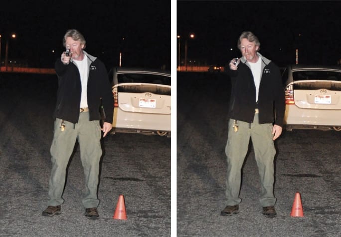 Mistake-of-fact shootings happen in all environments and traffic stops are no exception. In one of the above photos the subject is standing 40 feet from the light source and pointing a cell phone. In the other photo, he is pointing a Glock 23. Given a split-second to make a determination it is easy to see how the subject’s movements will have a huge impact on our ultimate interpretation of what we observe.