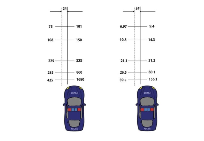 This is important for many reasons. The first being how it relates to the distance between the subject vehicle and your unit. Consistency on your part here will result in similar light conditions and ultimate visibility with each stop. The drastic drop in light illumination as measured off the beam's centerline is critical to the vehicle's offset when you position the unit. So is knowing this drop in illumination can be an asset on the approach and while maneuvering around the vehicles.