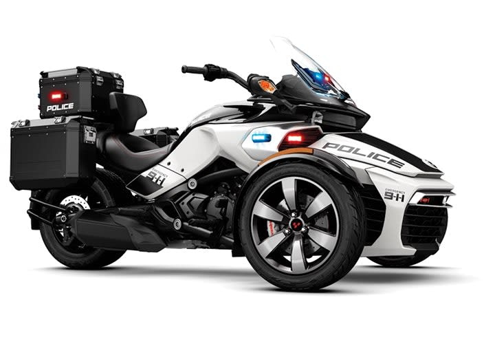 Designed as an alternative to a traditional two-wheeled motorcycle, BRP's three-wheeled Spyder F3-P is based on the company's Can-Am Spyder F3, which already provides stability with its three-wheel Y-frame and comes with advanced safety and security systems. The F3-P for law enforcement also comes with a siren, LED emergency lights, increased cargo capacity, and wires with 12V and USB connectors to meet motor officers' requirements.