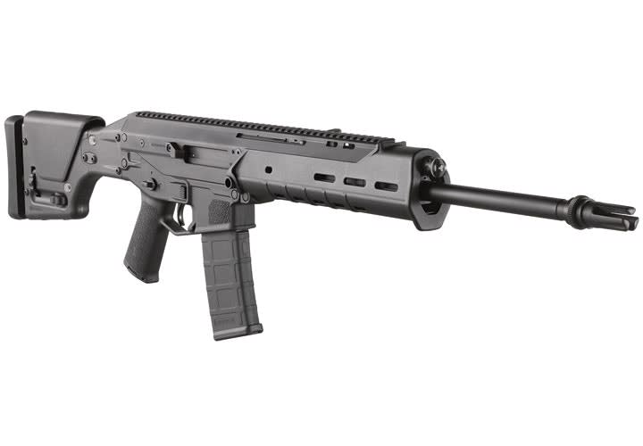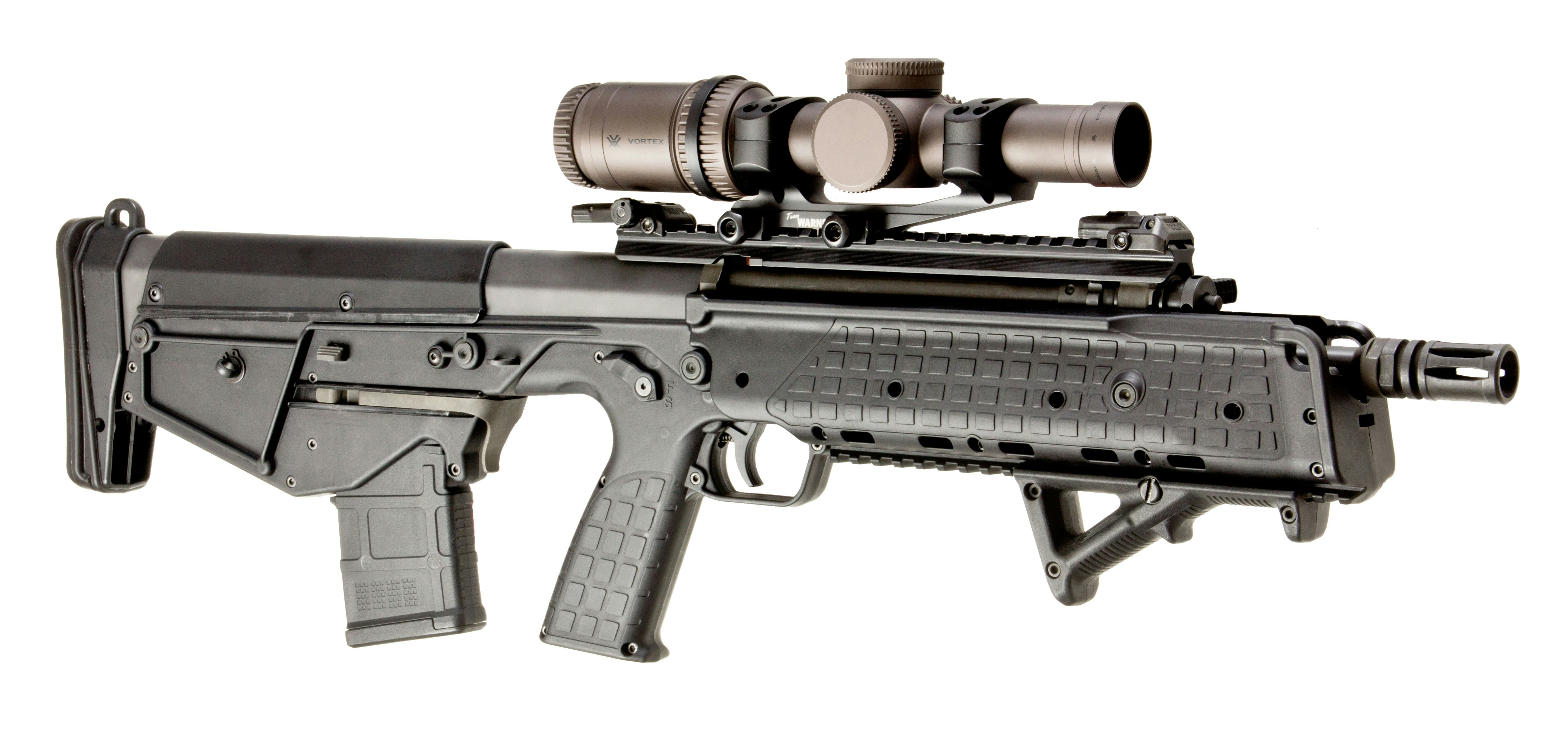 Kel-Tec says that with the design of its new 5.56mm RDB (Rifle Downward Eject Bullpup), it has solved the primary problem with the bullpup configuration. Traditional side eject bullpup rifles cannot be ambidextrous, and front ejection requires complicated mechanics, so Kel-Tec went with the downward eject design. The RDB features a rotary bolt with a spring-loaded ejector and an extractor facing down. The spent case is pulled backwards along the top of the magazine and then ejected down a vertical chute. The hammer is "U" shaped and runs outside the chute and above the magazine. Bolt travel in this design is longer than in traditional designs, but Kel-Tec says it is well within the ergonomic constraints of the rifle. Advantages of this design are gravity-assisted ejection, higher bolt energy at feeding, and a slower full-auto rate in select-fire models. The RDB is built around a common steel skeleton formed by the receiver and barrel sub-assemblies. Bolt, bolt carrier, firing mechanism, ejector chute, and bolt stop are identical for all variations. The short-stroke, gas-operated piston is fully adjustable for different ammunition and muzzle attachments. Barrel length is 17.4 inches; overall length is 27.4 inches. The rifle weighs 7 pounds empty.