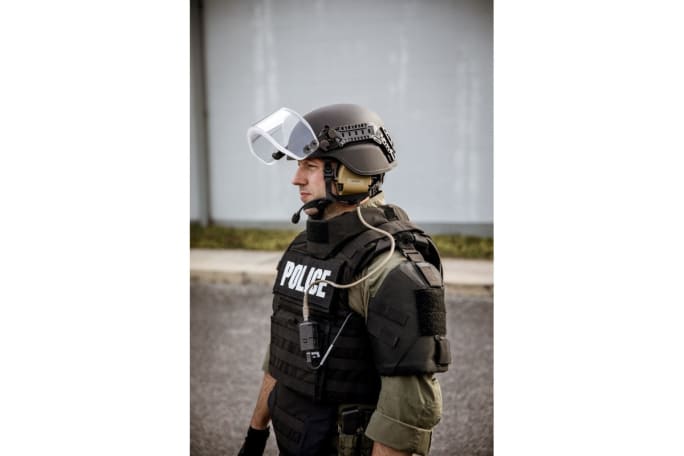 The Busch Protective AMP-1 TP Ballistic Helmet from Armor Express is the lightest composite helmet with VPAM certification in the world. It can be fitted with an optional non-ballistic face shield. (Photo: Armor Express)