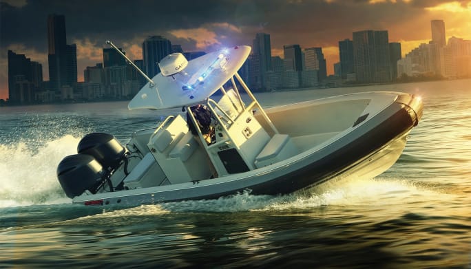 Brunswick's Impact D features a hybrid air/foam-filled collar mounted to a solid fiberglass gunnel. Instead of a fully circular tube, the Impact D-collar allows for more space on deck and added maneuverability and versatility for the crew. The D-collar gives customers the best characteristics of a standard fiberglass hull with the benefits of an RHIB. Law enforcement finds this design especially suited to tactical maneuvers, where boarding another craft may be necessary, according to the company.