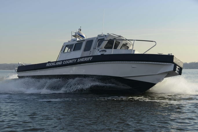 The Lake Assault custom patrol boat is now on duty with the Rockland County Sheriff's Department in New York. Manufactured from high-strength marine grade aluminum, the hull and superstructure are MIG and TIG welded throughout for added strength and long life. The craft is 31 feet long and features a full-width and forward leaning pilothouse, a davit crane, and a full array of advanced electronics. It is powered by dual 300 hp Mercury Verado 4-stroke outboards.