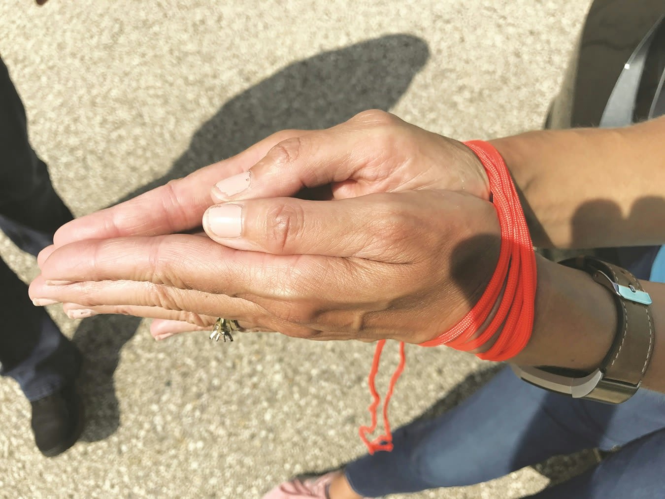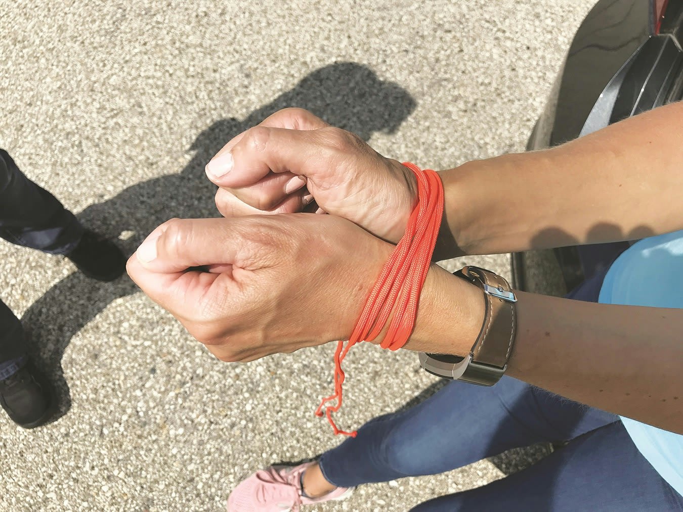 The above image is the wrong way to position your hands when being bound. (Photo: Anthony and Tracy Sherman from Genesis Group)