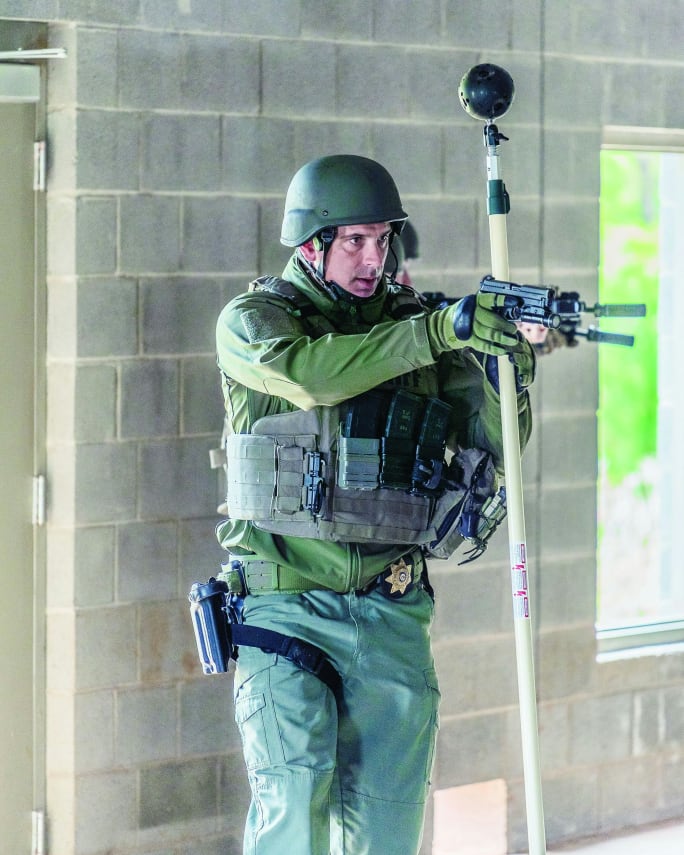 ) was one of the most interesting tools used by the scenario's law enforcement teams to locate, neutralize, and apprehend the gunman. The ball-shaped camera can be mounted on a pole or thrown into position. It was deployed in both ways during the scenario. Tactical officers used the pole camera to detect the location of the gunman and then threw the camera up to the third floor to track the gunman's movements as they ascended the stairs to engage him. Bounce Imaging says the camera has survived drops from high-flying drones onto concrete, so it's plenty tough to survive a throw. Regardless of how it lands after being thrown the device can capture video in any direction, as it features six cameras. The cameras can send video by 4G LTE to a dedicated device or to a smartphone or tablet.