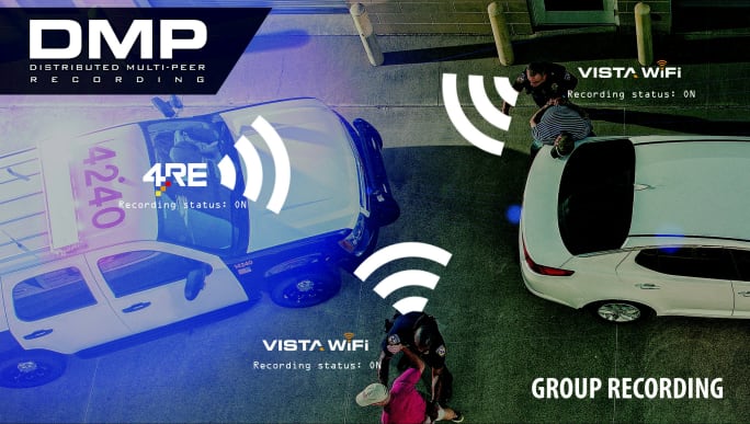 WatchGuard's 4RE HD Panoramic in-car video system and one or more Vista WiFi body-worn cameras are designed to work together seamlessly as a single system, capturing synchronized video of a single incident from multiple vantage points. The Wi-Fi capability in the body cameras and a Wi-Fi access point in the car allow the cameras to become members of a group recording network with the in-car system. Distributed Multi-Peer Recording technology distributes decision-making to in-car and body-worn cameras, giving any officer on the team the power to initiate a group recording in which all cameras in the recording group begin capturing synchronized video evidence. Recordings from the individual cameras are uploaded and automatically linked in evidence management software for viewing and sharing.