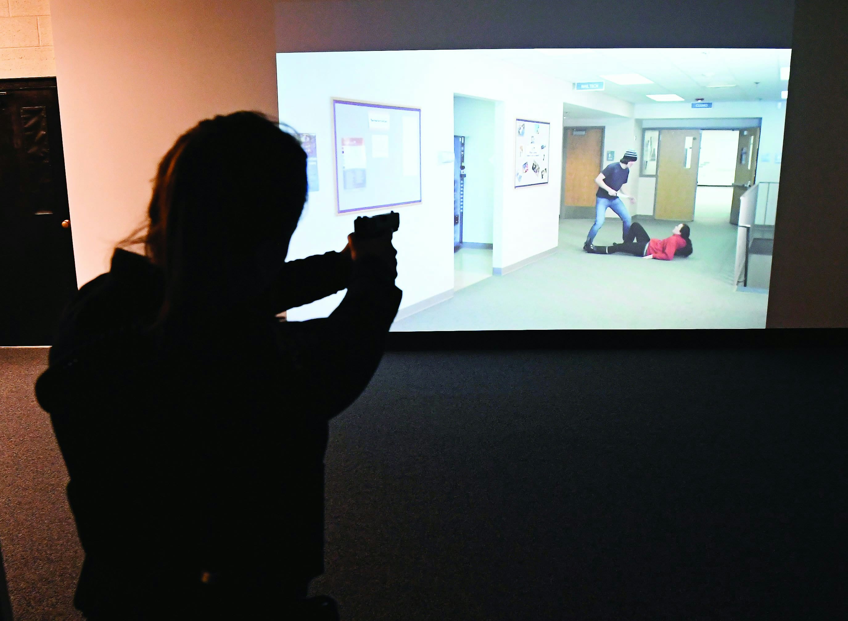 At the DeAngelis Center, law enforcement officers can work team or individual active shooter response situations in force-on-force or simulator-based scenarios. The simulator was donated by Jeffco-based Ti Training (