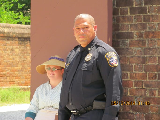 Lt. Greg Riley of the Williamsburg PD at the Magazine: “They’re great, we work hand in hand with them,” says Valerie Miller, a Foundation employee dressed in the period gown on this 90 degree day outside of the Magazine, the arsenal where the colony once stored its gunpowder, flints, tents and tools. “We see [the police] walking around, even at church functions, and say hi.” (Photo: Kristine Meldrum Denholm)