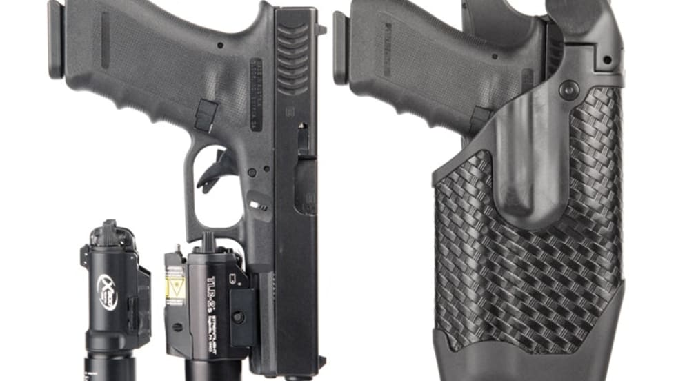 In the Blackhawk Epoch holster system, a wedge engages from the side of the holster and locks into the ejection port. The wedge is released when the shooter grips the pistol to draw and pushes down on a plunger with his or her thumb