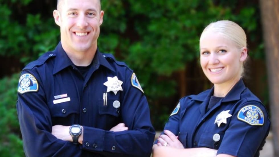 A few hours after ringing in the new year, Officer Jenni Byrd of the San Jose Police Department spotted a growing fire through the window of a woman's home. She and Officer Kris Kubasta rousted the sleeping woman and her friend upstairs and brought them outside to safety.