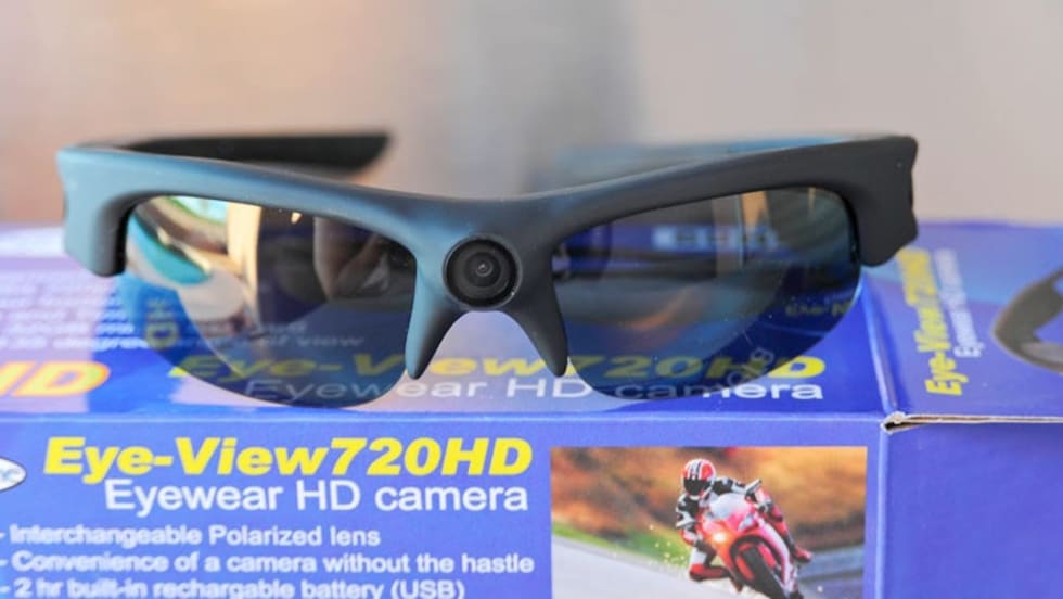 The Eye of Mine Eye-View 720HD camera sunglasses come with interchangeable clear and polarized grey lenses that have a high-definition video camera built into the bridge of the nose.