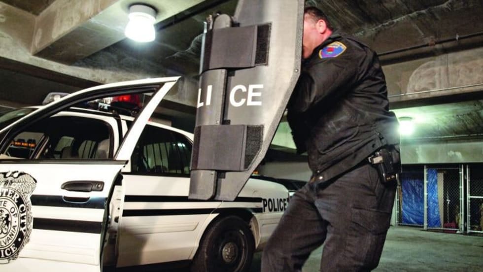 Newer shields developed with patrol officers in mind are lighter weight and designed to allow officers to shoot while carrying them. They can also easily fit in a patrol car.