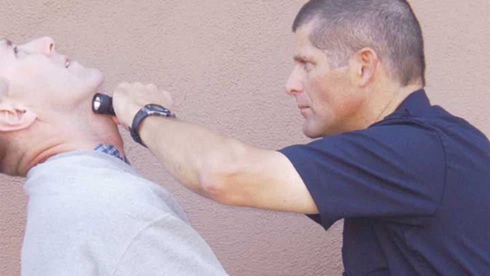 When you're involved in a life-and-death battle where someone is grabbing your gun, anything in your hand can be used as an equalizer to help you gain control of your gun and gain control of the suspect by striking him in the face or head.