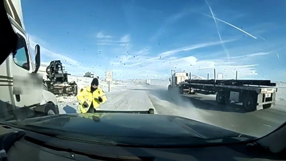 The video, released by the highway patrol through social media, shows the trooper at an accident scene with a vehicle in a snowy median. As he walks back along the edge of the road a truck careens past the left side of his cruiser.