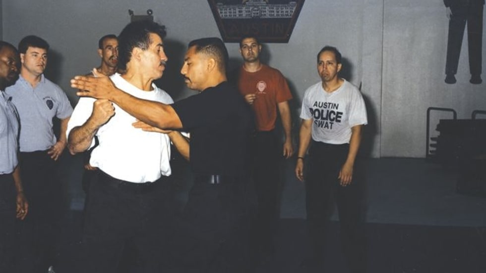 The introduction comes in the form of a three-minute round of body sparring in a 6X6-foot ring against the trainers, all noted martial artists and police DT instructors in their own right. Both the students and the instructors wear 16-ounce boxing gloves and headgear, but they still get hit and it still hurts.