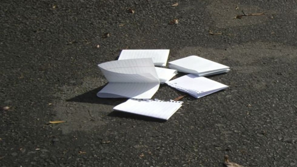 I think it was the little folded pieces of notebook paper that did it. Even now, years later, I can still remember it as though it happened only yesterday. Watching the little square pieces of paper gently flapping in the breeze as they lay in the roadway pushed the whole thing deep into my memory.
