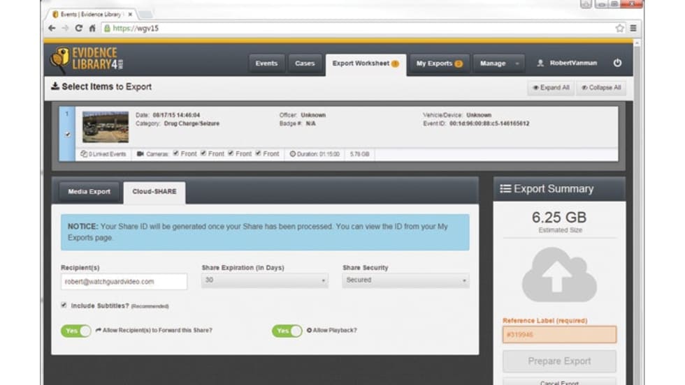 WatchGuard Video's Cloud-Share helps agencies find, copy, distribute, and track digital evidence via the cloud while still maintaining the original data in their on-premises servers.