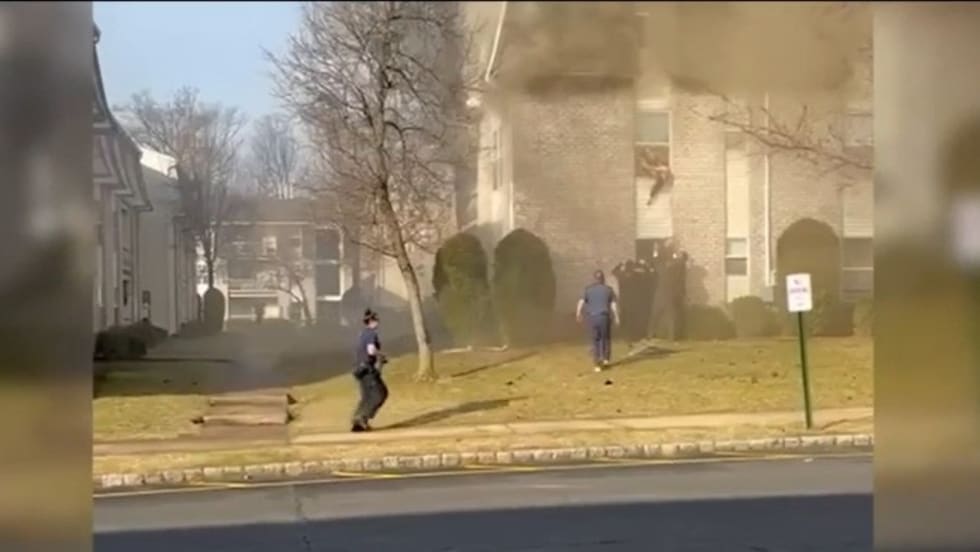 The man disappeared back into the apartment as the officers shouted from the ground for him to hurry, and he then reappeared with the toddler.