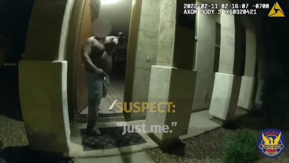 The suspect is shown standing in an open doorway, with the right side of his body facing outward. As the officer approaches, the suspect turns quickly revealing he is holding a handgun in his left hand and immediately fires multiple shots at the officer.