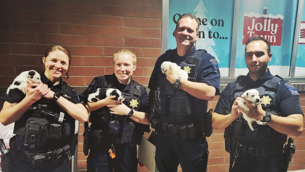 The officers learned that someone had left five puppies in a zipped duffel bag at a QT gas station and convenience store, and they decided to adopt them.