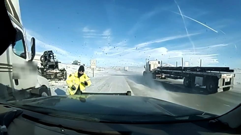 The video, released by the highway patrol through social media, shows the trooper at an accident scene with a vehicle in a snowy median. As he walks back along the edge of the road a truck careens past the left side of his cruiser.
