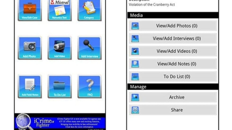 The iCrimeFighter app allows field investigators to keep accurate notes while they work a case. The app is simple to use, and you can easily add photos, videos, notes, and a to-do list to your case.