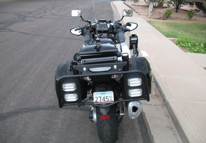 The Enforcer also uses only one battery to power its electronic police gear. Calkins recommended higher-quality LED emergency lighting, he said, to reduce the power draw from the battery. The bike arrives with a radio kill switch so an officer can preserve battery life when booking a subject or processing a DUI.
