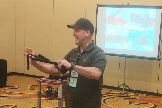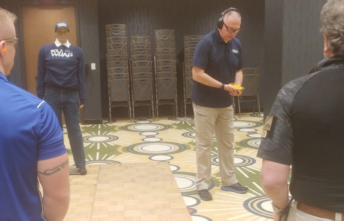 A Wrap Technologies master instructor teaches about the BolaWrap 150 during a certification class for instructors.