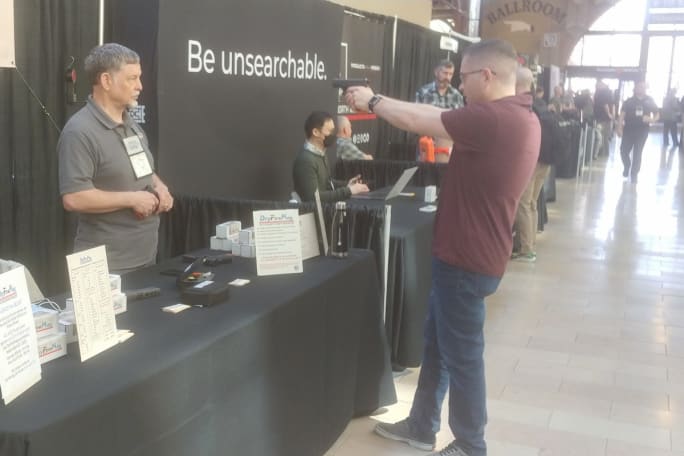 An ILEETA attendee checks out the function of DryFireMag during the expo.