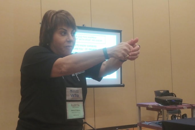 Attorney Marie D’Amico talks about the need for officers to articulate specifics about threats they faced when making decisions as she simulates a shooting stance.