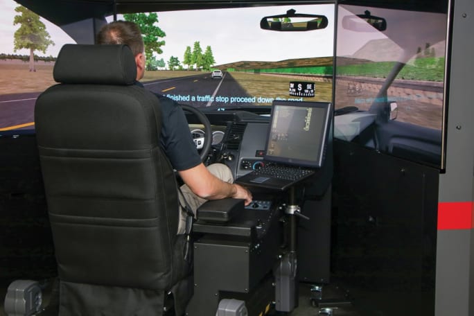 VirTra also demonstrated a driving sim at IACP. The VirTra Driver Training Simulator (V-DTS) is an immersive system that offers a variety of popular law enforcement vehicle models. Trainers can adjust traffic density, hazards, and weather. The system even gives students the feel of the road using hydraulics.
