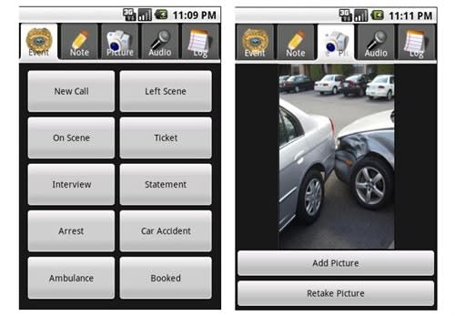 The Police Pad field app for Android allows officers to easily and simply document calls for service. The officer can mark "on scene," interview time, time of arrest, time the ambulance was called, and so on. There's a place to type notes, take photos through the device's camera, and record audio through the device's microphone.